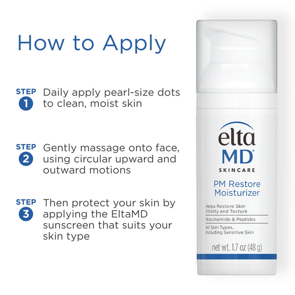 EltaMD PM Restore Moisturizer helps restore skin vitality and texture. Niacinamide and antioxidants help improve skin tone and texture, while hyaluronic acid and a ceramide hydrate and strengthen skin’s moisture barrier. The result is skin that looks smoother, brighter and healthy looking. Non-comedogenic, fragrance-free.